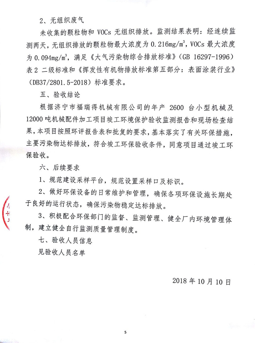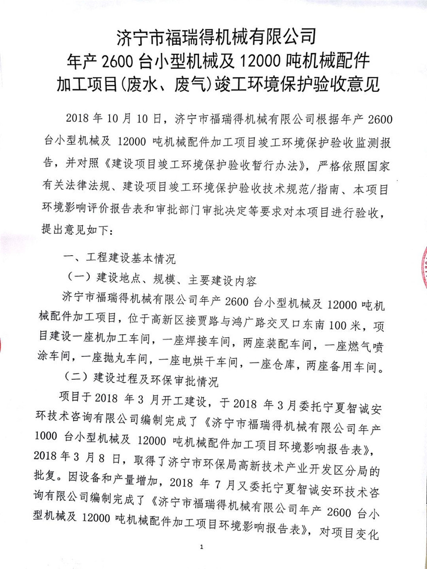 濟(jì)寧市福瑞得機(jī)械有限公司年產(chǎn)2600臺(tái)小型機(jī)械及12000噸機(jī)械配件加工項(xiàng)目(廢氣、廢水)竣工環(huán)境保護(hù)驗(yàn)收意見(jiàn)