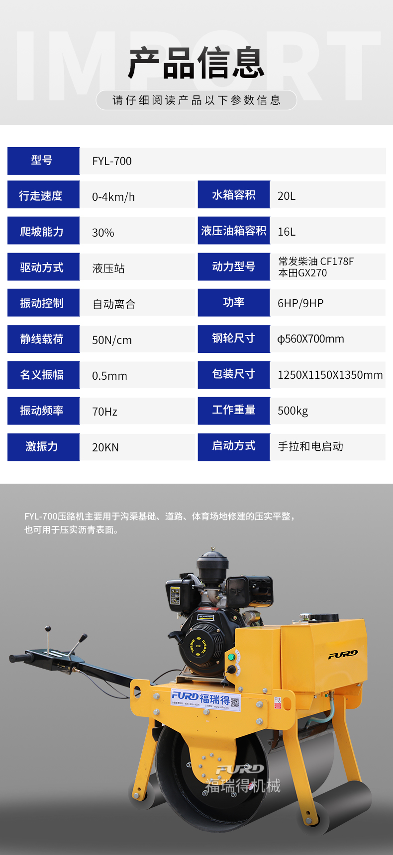 主要用于溝渠基礎(chǔ),道路,體育場地的壓實(shí)整平, 也可用于壓實(shí)瀝青表面的作業(yè)。