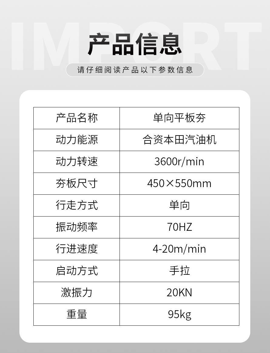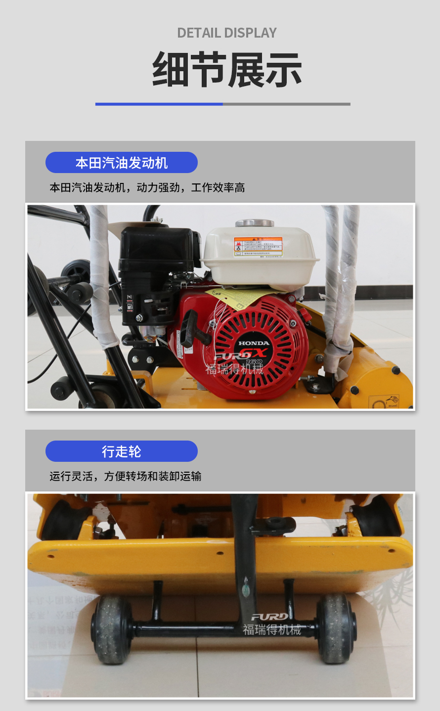 適用于路基邊緣、橋涵、管道、溝槽底部等狹長地帶的壓實。 本田汽油動力,名牌品質(zhì)保證。