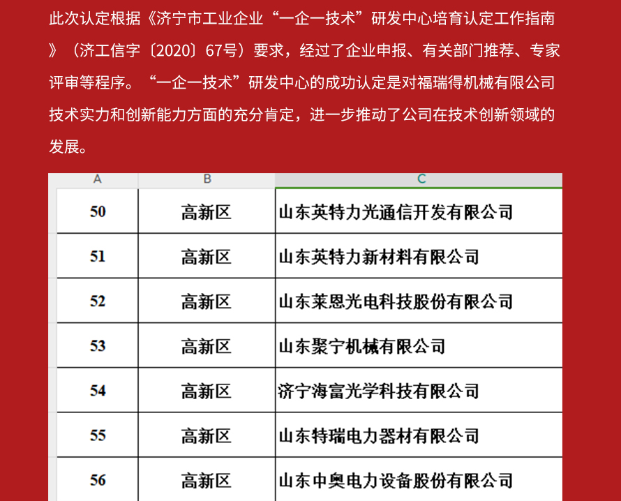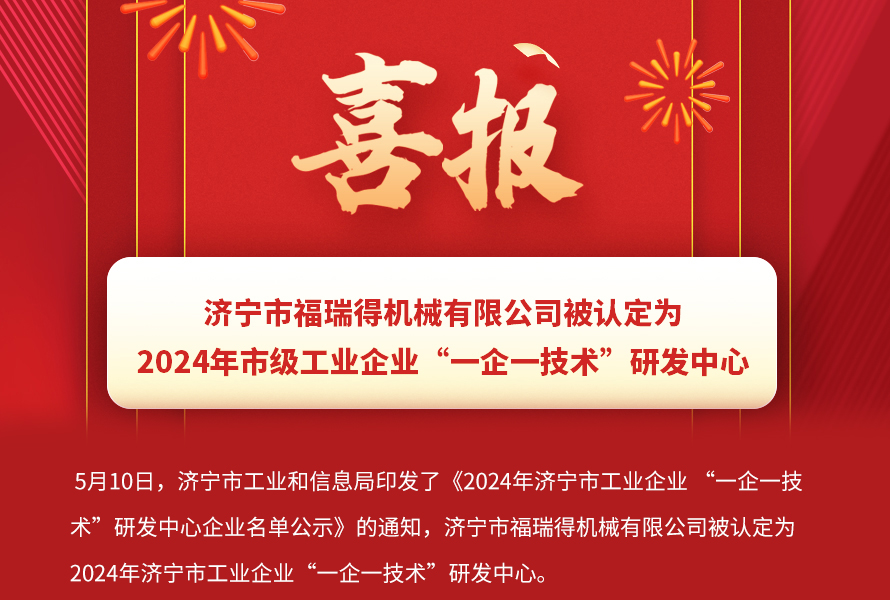 喜報(bào)!濟(jì)寧市福瑞得機(jī)械有限公司被認(rèn)定為市級工業(yè)企業(yè)“一企一技術(shù)”研發(fā)中心